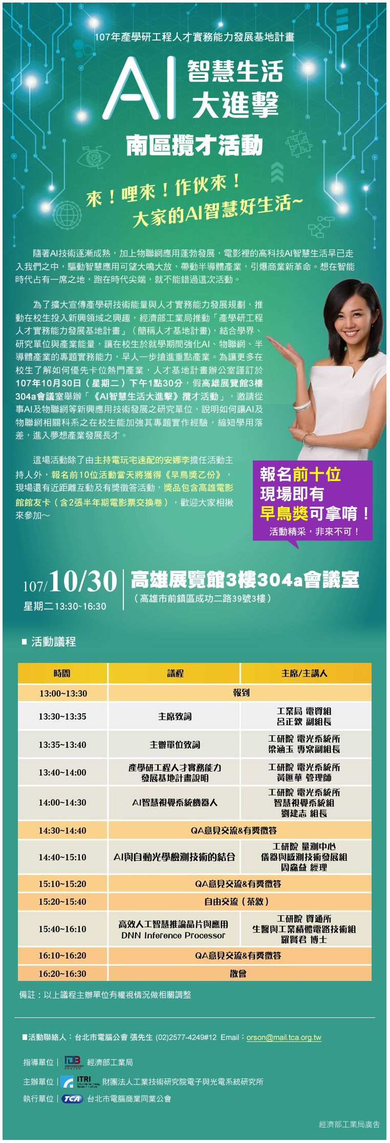 為了擴大宣傳產學研技術能量與人才實務能力發展規劃,推動在校生投入新興領域之興趣,經濟部工業局推動「產學研工程人才實務能力發展基地計畫」(簡稱人才基地計畫),結合學界、研究單位與產業能量,讓在校生於就學期間強化AI、物聯網、半導體產業的專題實務能力,早人一步搶進重點產業。為讓更多在校生了解如何優先卡位熱門產業,人才基地計畫辦公室謹訂於107年10月30日(星期二)下午1點30分,假高雄展覽館304a會議室舉辦「《AI智慧生活大進擊》攬才活動」,邀請從事AI及物聯網等新興應用技術發展之研究單位,說明如何讓AI及物聯網相關科系之在校生能加強其專題實作經驗,縮短學用落差,進入夢想產業發展長才。