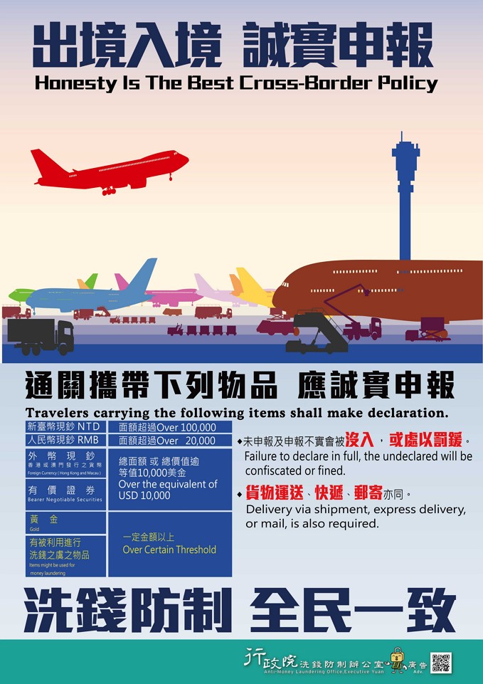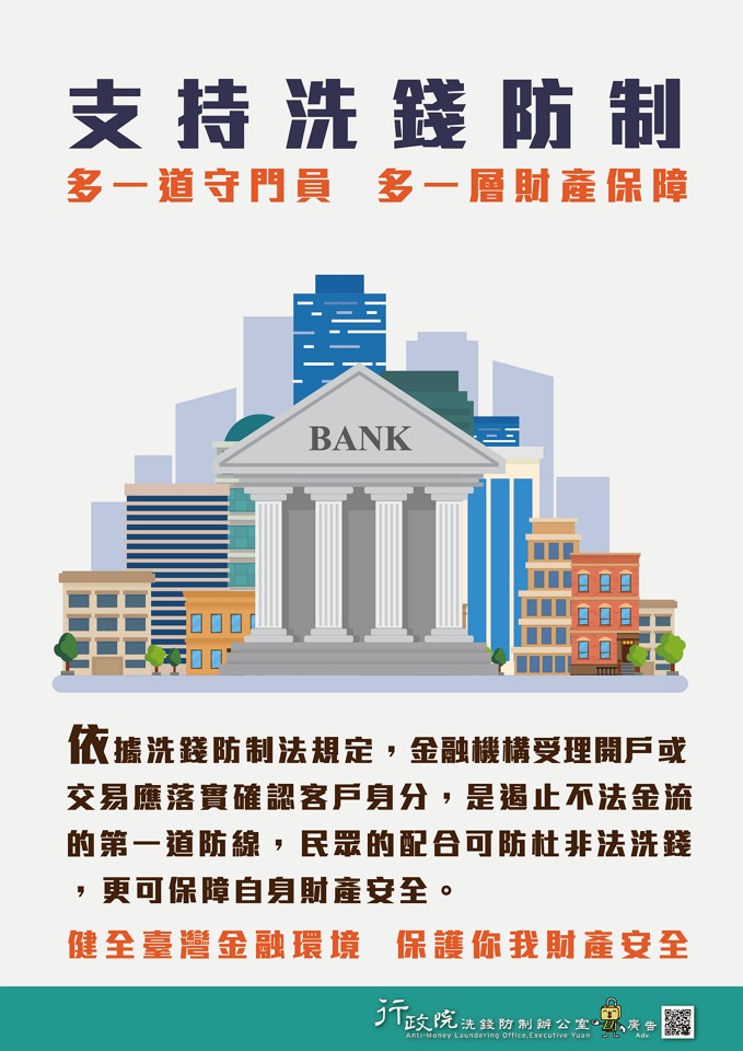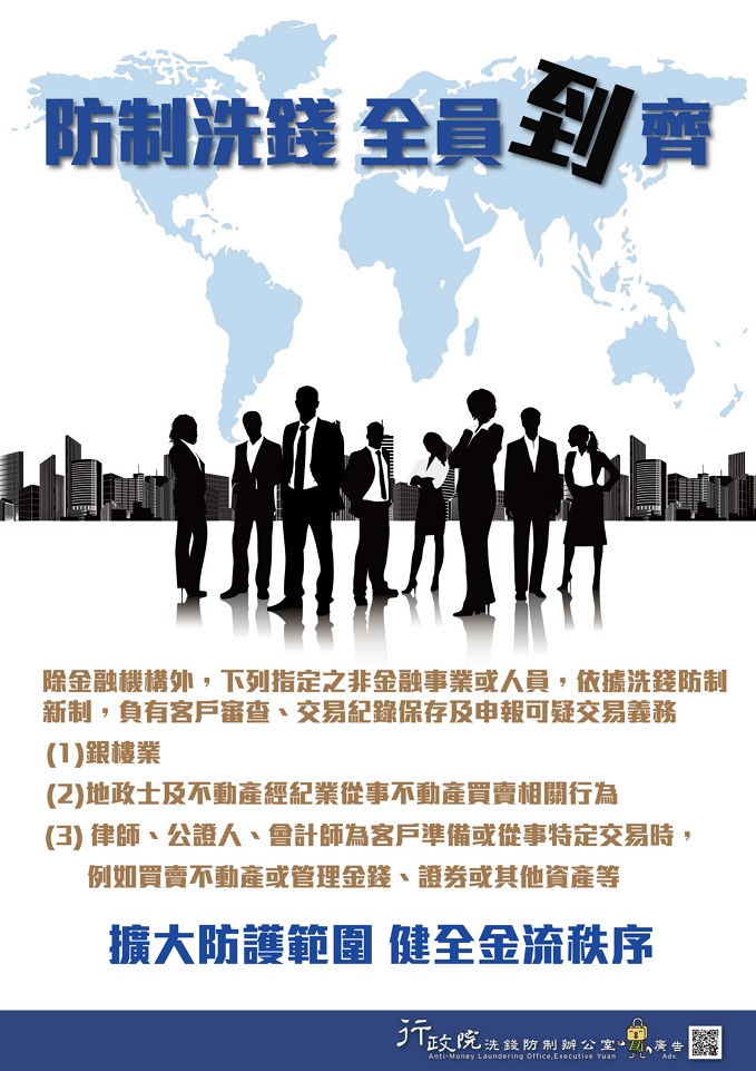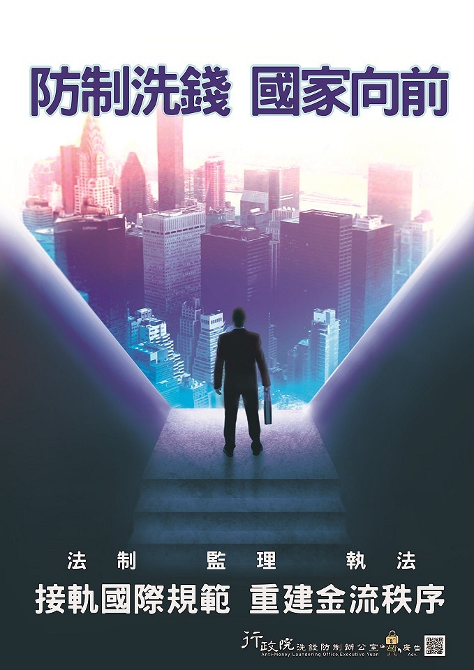 洗錢防制新法已於106年6月28日起開始施行,行政院洗錢防制辦公室製作「洗錢防制 國家向前」等4款海報及3支語音廣播檔(詳附件),期能達到全面宣導洗錢防制法新制之目的,使全民更加瞭解政府推動洗錢防制,保護國人財產安全之決心,以有效遏止不法洗錢活動之發生。